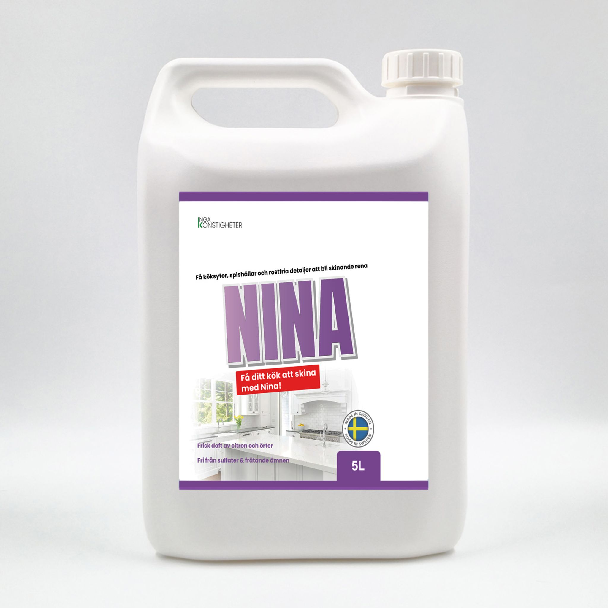 NINA er et effektivt rengøringsmiddel til køkkenrengøring, som nemt fjerner fedt, indgroet snavs og madrester uden at efterlade striber. Den kraftfulde men skånsomme formel gør produktet velegnet til daglig køkkenrengøring og efterlader en frisk duft af citron og urter.